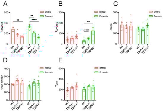 To further substantiate that TBPH influences Drosophila locomotor ability by regulating DCR, we treated larvae with enoxacin, a compound previously reported to enhance miRNA and siRNA biogenesis by facilitating Dicer recruitment to the AGO2 complex []. We analyzed larval locomotor behavior by categorizing movement states within a 1 min period into “Stillness” and “Motion”, as in the previous report []. Stillness was subdivided into “Pause” and “Head sweep”, while motion encompassed “Forward”, “Reverse”, and “Turn”. In flies treated with DMSO, a deficiency of TBPH induced alterations in locomotor states, predominantly in the “Forward” category. Compared to wild-type larvae, complete TBPH knockout significantly reduced the frequency of the “Forward” movement (Figure 7A). Although in TBPH-knockout flies, changes were observed in other movement categories, these did not reach statistical significance (Figure 7B–E). However, following enoxacin treatment, the locomotor tracking activity in TBPH-knockout larvae was modestly improved (Table S5). Compared to the control group, TBPH-knockout larvae treated with enoxacin exhibited an increase in the “Reverse” movement state (Figure 7B). Conversely, TBPH+/− and TBPH−/− still showed a significant reduction in the “Forward” movement state despite enoxacin treatment (Figure 7A). These results provide further evidence of a close relationship between TBPH and DCR in regulating locomotor behavior in Drosophila.