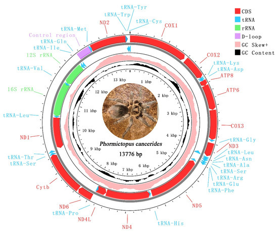 Mitochondrial genome of Phormictopus cancerides. The red represents PCGs; blue represents tRNAs; green represents rRNAs; purple represents CR; pink represents positive GC skew; and black represents GC content.