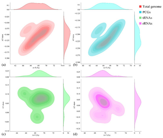 Nucleotide composition (AT skew vs. A + T content) of ten Theraphosidae mitogenomes: whole genome (a), PCG (b), tRNA (c), and rRNAs (d).