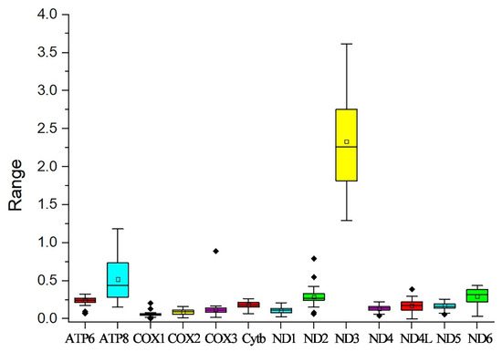 Ka/Ks values for the 13 PCGs of the ten Theraphosidae mitogenomes in this study. Black dots represent outliers.