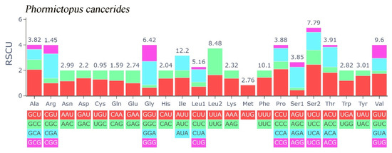 Relative synonymous codon usage of Phormictopus cancerides mitogenome; the stop codon is not included.