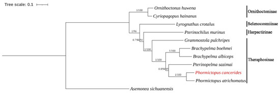 A total of ten mitogenomes from four subfamilies of the family Theraphosidae were included in our phylogenetic analyses (Table 1). Additionally, A. sichuanensis was selected as the outgroup to establish their phylogenetic tree. Phylogenetic trees of the BI and ML analyses were constructed based on 13 PCG nucleotide sequences; the BI and ML trees shared an identical topological structure.