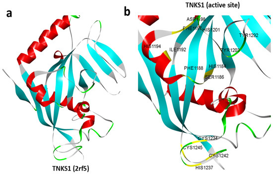 Structure of TNKS1. (a) Three-dimensional representation of the retrieved experimental structure of TNKS1 (2rf5). (b) Retrieved structure of TNKS1 showing active site residues (highlighted in yellow).