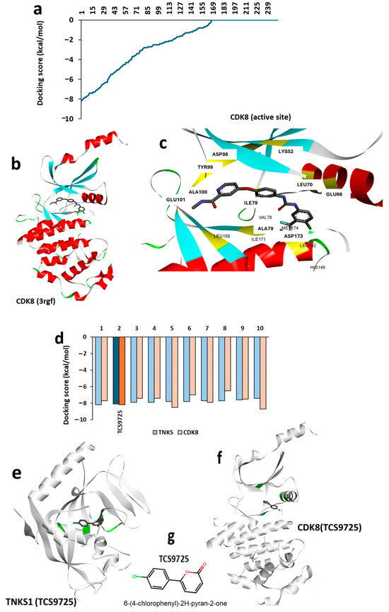 In order to identify top lead molecules, high-throughput virtual screening (HTVS) was performed on the ChemBridge library against the TNKS1 active site using the diversity-based high-throughput virtual screening (D-HTVS) method. The distribution of predicted docking scores is represented as a histogram (Figure 2a), showing a wide range of binding affinities across the screened compounds. To investigate potential dual-target inhibitors, the three-dimensional structure of CDK8 was retrieved from the Protein Data Bank (PDB ID: 3rgf) (Figure 2b). A cartoon representation of CDK8 was generated, highlighting the active site and its associated residues in yellow (Figure 2c). Screening results were further refined, and a histogram depicting the docking scores of the top 10 molecules from the TNKS1 screening was generated (Figure 2d), emphasizing compounds with potential dual interactions. Among the top-ranked molecules, 6-(4-chlorophenyl)-2H-pyran-2-one (internal reference number TCS9725) was identified as a promising dual inhibitor, with a reasonable binding score for both TNKS1 and CDK8. The three-dimensional representation of TCS9725 binding to TNKS1 at its active site is shown in Figure 2e, while its binding conformation at the CDK8 kinase domain is presented in Figure 2f. The 2D representation of the identified lead candidate is depicted in Figure 2g.