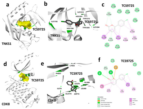 Protein–ligand interaction analysis. (a) Molecular surface representation depicting the ligand-binding region in TNKS1. (b) Cartoon representation showing the interactions of TCS9725 at the active site of TNKS1. (c) Two-dimensional representation showing the interactions of TCS9725 along with the nature of bonds. (d) Molecular surface representation depicting the ligand binding region in CDK8. (e) Cartoon representation showing the interactions of TCS9725 at the active site kinase domain of CDK8. (f) Two-dimensional representation showing the interactions of TCS9725 along with the nature of bonds.