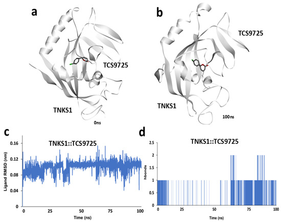 Molecular dynamic simulation of TNKS1:: TCS9725 complex. (a) Snapshot of simulation trajectory taken at 0 ns. (b) Snapshot of simulation trajectory taken at 100 ns. (c) Ligand RMSD calculated from 100 ns simulation trajectory and (d) time-course representation of average h-bonds calculated between TNKS1 and TCS9725 from 100 ns simulation trajectory.