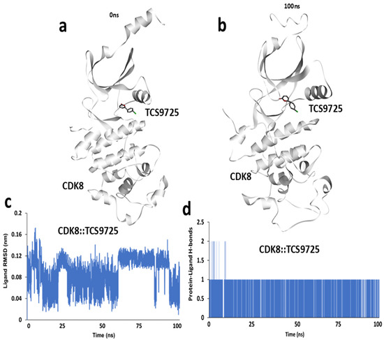 Molecular dynamic simulation of CDK8:: TCS9725 complex. (a) Snapshot of simulation trajectory taken at 0 ns. (b) Snapshot of simulation trajectory taken at 100 ns. (c) Ligand RMSD calculated from 100 ns simulation trajectory and (d) time-course representation of average h-bonds calculated between CDK8 and TCS9725 from 100 ns simulation trajectory.
