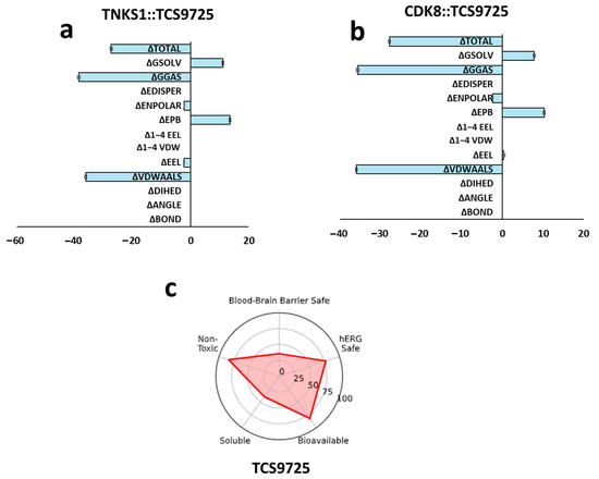 Gibbs binding free energy estimation and ADMET property predictions. (a) Histogram representing MMPBSA results for Gibbs binding free energy estimation from 100 ns trajectory for TNKS1::TCS9725 complex. (b) Histogram representing MMPBSA results for Gibbs binding free energy estimation from 100 ns trajectory for CDK8::TCS9725 complex. (c) Predicted ADMET properties for the lead molecule TCS9725.