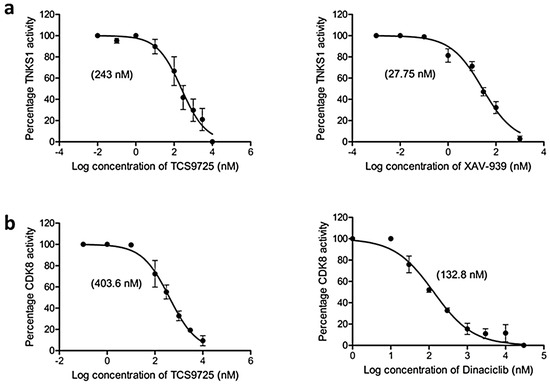 TCS9725 inhibited TNKS1 and CDK8 activity. The effect of TCS9725 and standard compounds at various concentrations was evaluated concerning (a) TNKS1 and (b) CDK8 activities and the IC50 values are presented. GraphPad Prism version 6.0 was used to examine the mean ± SD results from three studies.