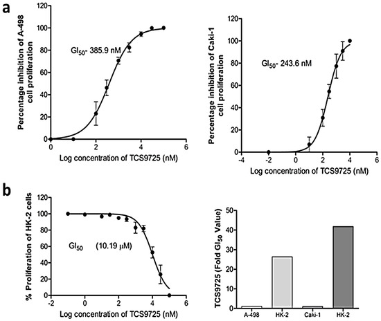 We next checked the activity of TCS9725 against the proliferation of RCC cells. The antiproliferative effect of the compound was tested in A-498 cells and Caki-1 cells. TCS9725 inhibited the proliferation of A-498 cells and Caki-1 cells, with respective GI50 values of 385.9 nM and 243.6 nM (Figure 8a). The effect of the compound on normal, non-cancerous HK-2 cell proliferation was found to be inhibited at 10.19 μM (Figure 8b). The compound inhibited HK-2 cell proliferation at 26.4-fold- and 41.83-fold-higher GI50 values when compared with A-498 and Caki-1 cells, respectively (Figure 8b). We used the respective GI50 values of the compound (386 nM for A-498 cells and 244 nM for Caki-1 cells) for further assays.