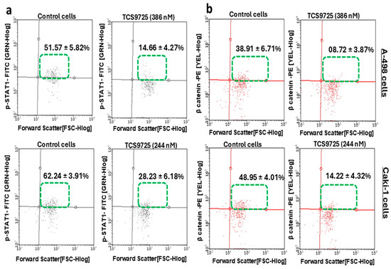 The phospho-STAT-1- and β-catenin-positive population in RCC cells was suppressed by TCS9725. The endogenous phospho-STAT-1(Ser727) population (a) and the β-catenin population (b) were reduced in A-498 and Caki-1 cells by TCS9725 when compared to the respective untreated control cells. Representative graphs are presented. Numerical values are mean ± SD from three individual experiments. Statistical significance at p < 0.05.
