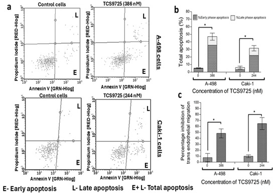 Shows the effect of TCS9725 on RCC apoptosis and trans-cell migration. TCS9725 triggered both early-phase and late-phase apoptosis in A-498 and Caki-1 cells after 48 h of treatment. (a) Representative Annexin V test graphs showing TCS9725 inducing early and late apoptosis in A-498 and Caki-1 cells. (b) Histograms showing the effectiveness of TCS9725 in inducing early, late, and total apoptosis in RCC cells. (c) The compound effectively inhibited the migration of A-498 and Caki-1 cells across the HUVEC membrane in the presence of 10 ng/mL TGF-β, a chemoattractant. * p ≤ 0.05 was considered statistically significant. Results were reported as mean ± SD from three experiments.