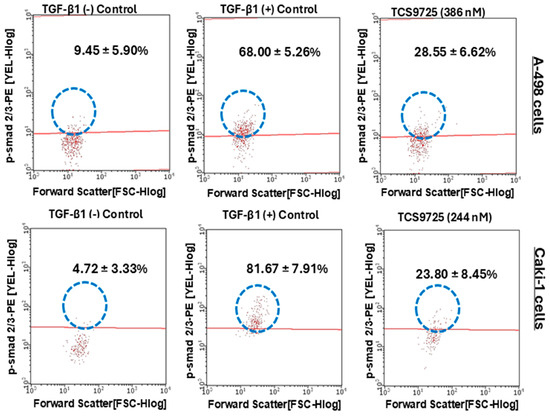 To demonstrate the mechanistic activity of TCS9725’s efficacy on the migration of RCC cells, we investigated TGF-β-stimulated smad2/3 signaling by flow cytometry. In the A-498 cells, 10 ng/mL TGF-β stimulated p-smad2/3-positive populations from 9.45 ± 5.90% to 68.00 ± 5.26% (Figure 11). Treatment with 386 nM TCS9725 reduced p-smad2/3-positive populations to 28.55 ± 6.62% in these cells (Figure 11). Caki-1 cells exhibited an 81.67 ± 7.91% p-samd2/3-positive population when stimulated with TGF-β, while the TGF-β (−) control exhibited a 4.72 ± 3.33% p-smad2/3-positive population (Figure 11). Treatment with 244 nM of TCS9725 reduced the p-smad2/3-positive populations to 23.80 ± 8.45% in these cells (Figure 11).