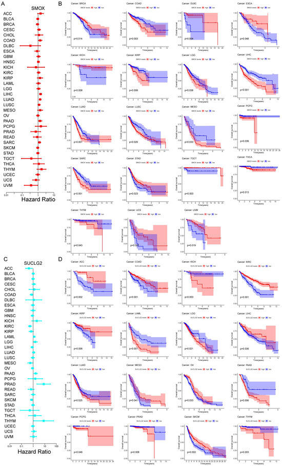 Pan-cancer survival analysis. (A) Cox regression analysis results based on SMOX expression in pan-cancer. (B) The Kaplan–Meier survival curves of pan-cancers between the high and low SMOX expression groups; (C) Cox regression analysis results based on SUCLG2 expression in pan-cancer. (D) The Kaplan–Meier survival curves of pan-cancers between the high and low SUCLG2 expression groups.