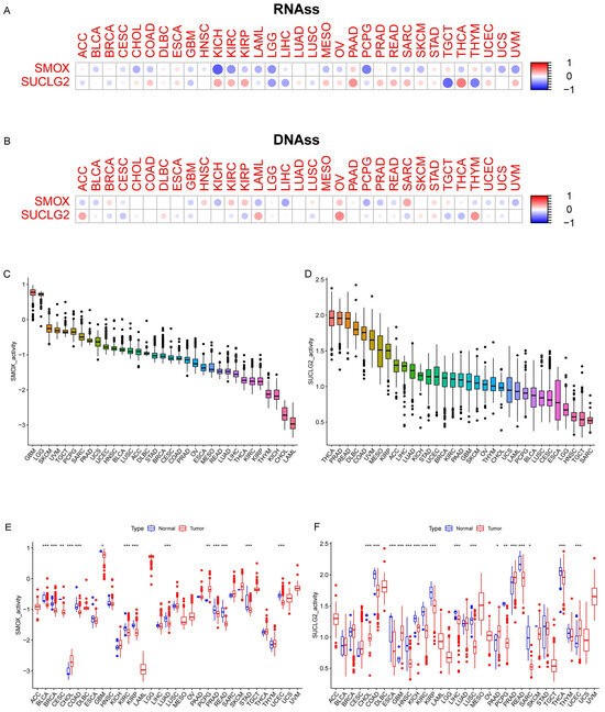 (A) Correlation analysis results of SMOX and SUCLG2 with RNAss and (B) DNAss in pan-cancer. (C,D) SMOX and SUCLG2 activity in pan-cancer. (E,F) Differences in SMOX and SUCLG2 activity in pan-cancer. “*” represents p < 0.05; “**” represents p < 0.01; and “***” represents p < 0.001.