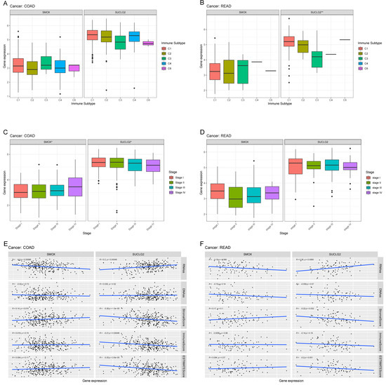 Correlation results for SMOX and SUCLG2 with the (A,B) immunophenotypes, (C,D) stages, and (E,F) TME scores of COAD and READ.