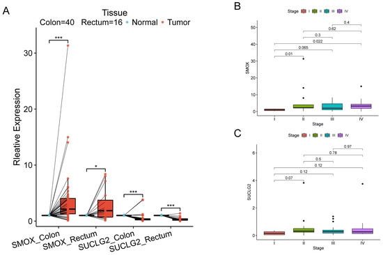 (A) qPCR results for SOMX and SUCLG2 in CRC and adjacent normal colorectal tissues. (B,C) Correlation analysis between SMOX and SUCLG2 and pathological stage. “*” represents p < 0.05; and “***” represents p < 0.001.