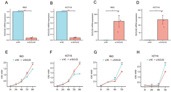 (A) The efficiency of siRNAs verified by qRT-PCR in RKO. (B) The efficiency of siRNAs verified by qRT-PCR in HCT116. (C) The efficiency of overexpression verified by qRT-PCR in RKO. (D) The efficiency of overexpression verified by qRT-PCR in HCT116. (E) CCK-8 assay of RKO after transfection with si-SUCLG2. (F) CCK-8 assay of HCT116 after transfection with si-SUCLG2. (G) CCK-8 assay of RKO after transfection with p-SUCLG2. (H) CCK-8 assay of HCT116 after transfection with p-SUCLG2. “*” represents p < 0.05; “**” represents p < 0.01; and “***” represents p < 0.001.