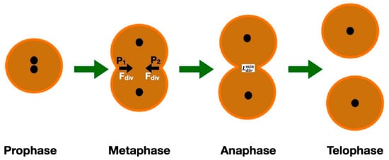 It is generally accepted that a tumor arises from one genetically altered cell, which accumulates several mutations over a prolonged period [,]. This cell does not conform to the growth-controlling mechanisms that normal cells obey. It grows fast and changes its microenvironment by developing gradients of key metabolites such as glucose, oxygen, and growth factors. These gradients are a result of the tumor’s rapid growth and inefficient vasculature, leading to regions of hypoxia and nutrient deprivation. This metabolic reprogramming, including the preference for glycolysis even in the presence of oxygen (Warburg effect), supports cancer cell survival and proliferation in a challenging microenvironment [,]. These biochemical changes affect both the survival and the development of cancer cells []. Moreover, it has been shown that cancer cell growth is also influenced by differentiated signaling pathways, which have resulted from mutations and are activated during the process. In a hypoxic environment, common in rapidly growing tumors, cell metabolism changes and overridden apoptotic pathways also seem to be essential for both the survival and proliferation of cancer cells [,]. When a cancerous parent cell becomes mature and reaches a proliferative size, it may split into two cells through the process of mitosis. It is known that tumor progression is characterized by abnormal cell proliferation, due to the altered expression of proteins related to the cell cycle. A mathematical modeling of the contractile forces applied to the cancer cell during the metaphase, as well as the minimum length between the opposing walls of the plasma membrane for the division to occur, is given by the following [] (Figure 1):