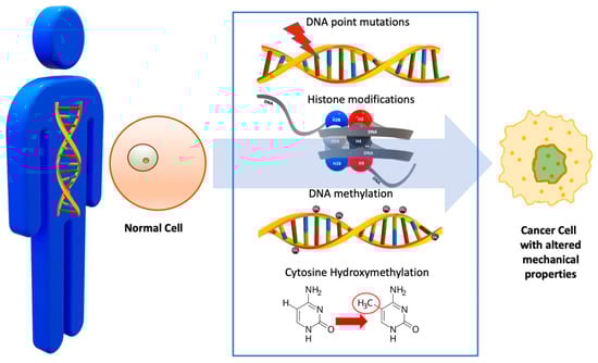| DNA Point Mutations | Point mutations in driver genes (e.g., BRCA2, TP53, KRAS) [] | Disruption of crucial processes like DNA repair, apoptosis, and cell division, as well as alterations in cytoskeletal organization, leading to changes in cell stiffness and deformability [] | Mutations can lead to abnormal cell proliferation, migration, and invasion and impact cancer progression and therapy [] |