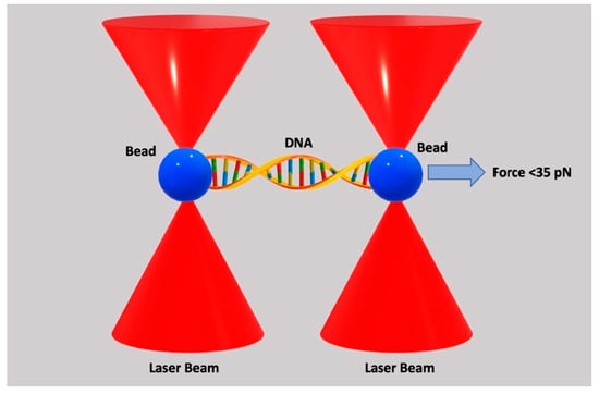 where is the extension of the DNA, is the contour length, is the Boltzmann constant, is the absolute temperature, is the exerted force, represents the persistence length, is the modulus of stretching, while is the twist–stretch coupling. It should be mentioned that changes sign at forces close to 35 pN, as the DNA starts unwinding []. When the applied force is above 60 pN, the DNA will overstretch, following a clear saw-tooth configuration [].