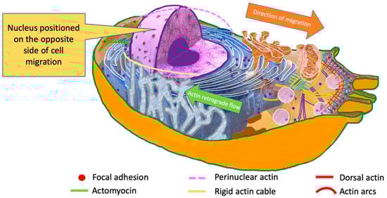 During invasion, cancer cells need to pass through multiple confinements, which are sometimes smaller than the cells’ original size. Therefore, nucleus deformation during cancer cell migration is very important, as the nucleus represents the largest cell organelle [,,]. In addition to deformation, the position of the nucleus seems to be significant. During the migration process, cytoskeleton and organelles are re-arranged. The nucleus is positioned on the opposite side of that of the migration [,,] (Figure 4).