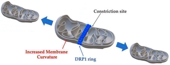 The process of mitochondrial fission requires the synergetic action of multiple proteins, changing the shape of the mitochondrion. In the middle, there is a constriction site, due to the action of DRP1, while DNM1 contributes to the increased membrane curvature, observed everywhere except the middle portion of the mitochondrion.
