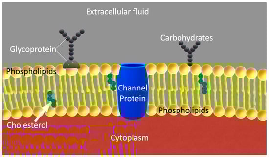 The plasma membrane is not only a barrier isolating the cell from its environment, but an organelle as well, consisting of lipids in a bilayer arrangement, including numerous specialized proteins (Figure 6), which play an active role in sensing and responding to environmental cues, a function that becomes crucial in the altered microenvironment of cancer []. This membrane is involved in several important cellular functions, including structural support, transportation of nutrients inside the cell, transportation of toxic substances out of the cell, biomechanical and biochemical signaling, and motion [,]. Furthermore, the plasma membrane is also involved in several disease processes, including cancer [].