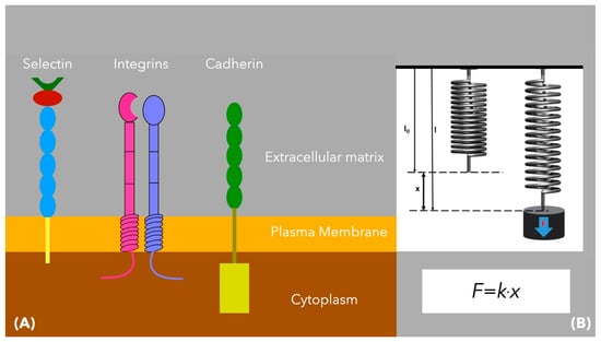 (A) The main adhesion proteins providing connection between cancer cells or between cancer cells and normal cells are the integrins, cadherins, and selectins. (B) In the model of Rejniak [,], these proteins are modeled as linear springs, satisfying Hooke’s law.