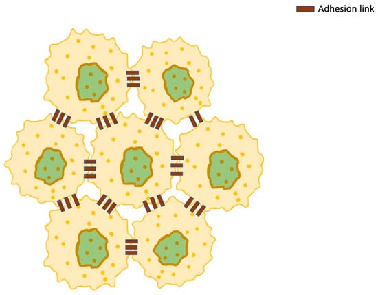 As each cancer cell is in contact with adjacent malignant or healthy cells, its plasma membrane has been modeled as a group of points [,]. These points refer to transmembrane adhesion proteins, mediating cell-to-cell interactions and mechanical communication between cells. The most important of these proteins include integrins, cadherins, and selectins. These have been modeled as linear springs, satisfying Hooke’s law (Figure 7).