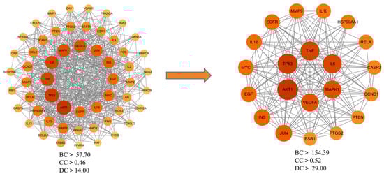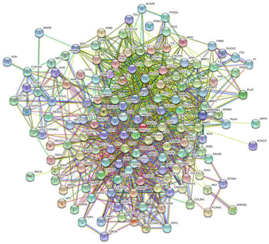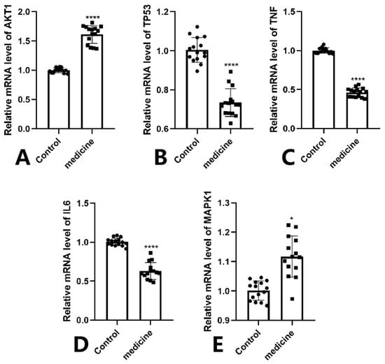 Figure 8). Furthermore, the most potent active compound identified in our study—quercetin—was individually docked with the remaining four top-ranked core targets identified through PPI network construction and hub gene screening: TP53, TNF, IL6, and MAPK1. The corresponding binding conformations were also visualized using PyMOL (