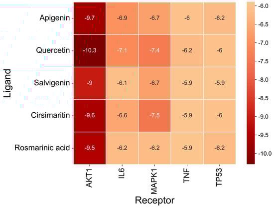 Table 9) showed that all compound–target pairs exhibited minimum binding energies lower than −5.0 kcal/mol, suggesting favorable and stable interactions. Among them, quercetin showed the strongest binding affinity with AKT1, with a minimum binding energy of −10.3 kcal/mol, indicating that this compound–target interaction may play a central role in the pharmacological mechanism of Fespixon cream for diabetic foot ulcer treatment. The binding conformations were visualized using PyMOL software (