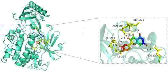 These residues collectively form a polar and hydrophobic microenvironment, tightly stabilizing the ligand. Notably, THR-211 and ASN-204 are located in the AKT1 hinge region and may influence kinase activity regulation, suggesting that quercetin could act as a competitive or allosteric modulator. The hydrogen bond distances (1.9–3.2 Å) fall within the optimal interaction range, reinforcing the high-affinity binding observed in the docking score (−10.3 kcal/mol) [