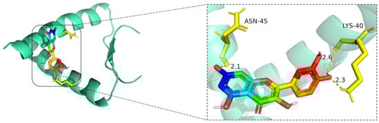 ASN-45 forms a strong hydrogen bond with the hydroxyl group of quercetin at a distance of 2.1 Å, contributing to anchoring the chromone scaffold.