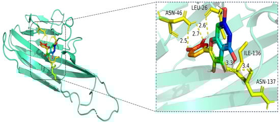 ILE-136 and ASN-137 contribute to hydrophobic and polar contacts, respectively, with distances of 3.3 Å and 3.4 Å, indicating weaker but spatially close interactions that help stabilize the complex.