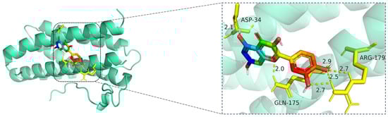 Collectively, these interactions create a moderately hydrophilic binding environment, stabilizing quercetin within the TNF-α trimer interface. The interaction distances fall within the favorable range for hydrogen bonding (2.5–3.4 Å), supporting the predicted binding affinity.