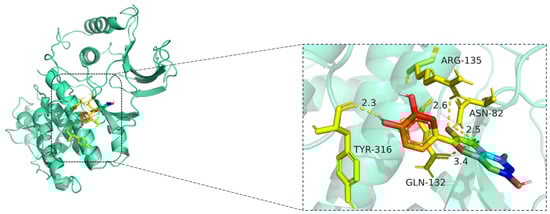 TYR-316 forms a hydrogen bond with the hydroxyl group of quercetin at a distance of 2.3 Å, stabilizing the phenolic moiety.