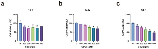 Effect of CoCl2 on cell viability detected by CCK-8 method: (a): Cell viability after 12 h induction: 200, 300, 400 μM CoCl2 groups, * p < 0.05; (b): cell viability after 24 h induction: 200, 300, 400, 500 μM CoCl2 groups, * p < 0.05; (c): cell viability after 36 h induction: 100, 200, 300, 400, 500 μM CoCl2 groups, * p < 0.05.