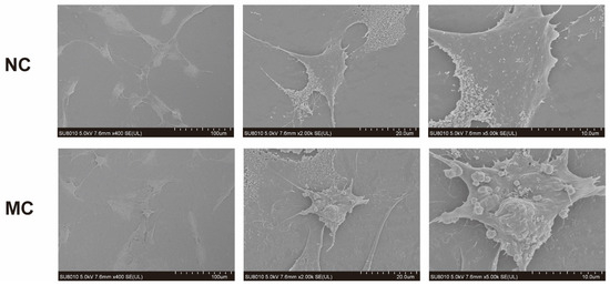 A scanning electron microscope (SEM) was used to observe the morphology of normal cells and cells subjected to hypoxia treatment induced by CoCl2. SEM-specific cover slips were placed in a six-well plate with 1.5 × 105 cells seeded per well, and cultured in a 37 °C, 5% CO2 incubator for 24 h to allow cells to adhere and fully extend. The experimental groups were set as normal and model groups. Both groups were treated for 24 h under the same culture conditions. After the cells formed a monolayer, they were rinsed three times with PBS, each time for 3 min. Subsequently, PBS was aspirated dry, and fixative was gently added along the well wall. After PBS washing, cells were fixed with 2.5% glutaraldehyde in 0.1 M phosphate buffer (pH 7.4) for 2 h at 4 °C. Samples were then dehydrated through an ethanol gradient (30%, 50%, 70%, 90%, and 100%, × 3), critical-point dried with liquid CO2, and sputter-coated with 10 nm gold–palladium. Finally, the samples were sent to the Electron Microscopy Center at Chongqing Medical University for observation.