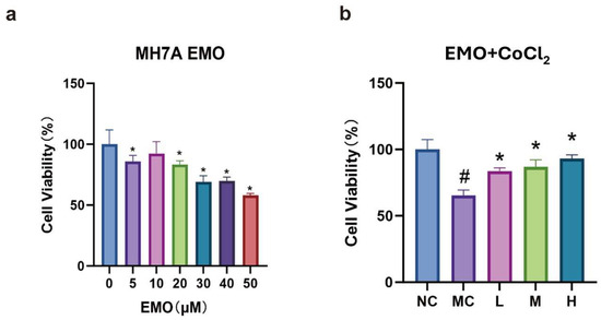 (a) Cell viability affected by emodin alone; (b) cell viability under the combined effect of emodin and CoCl2. NC: normal group, MC: model group (CoCl2: 300 μM), L: low-dose emodin group (CoCl2: 300 μM, Emo: 5 μM), M: medium-dose emodin group (CoCl2: 300 μM, Emo: 10 μM), H: high-dose emodin group (CoCl2: 300 μM, Emo: 20 μM). In graph a, compared to the normal group, # p < 0.05 for the model group; compared to the model group, * p < 0.05 for the emodin groups.