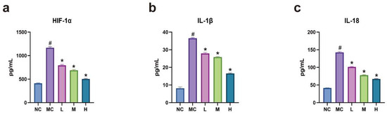 (a–c) ELISA results for detecting HIF-1α, IL-1β, and IL-18: NC: normal group, MC: model group (CoCl2: 300 μM), L: low-dose emodin group (CoCl2: 300 μM, Emo: 5 μM), M: medium-dose emodin group (CoCl2: 300 μM, Emo: 10 μM), H: high-dose emodin group (CoCl2: 300 μM, Emo: 20 μM). Compared to the normal group, # p < 0.05 for the model group; compared to the model group, * p < 0.05 for the emodin groups.