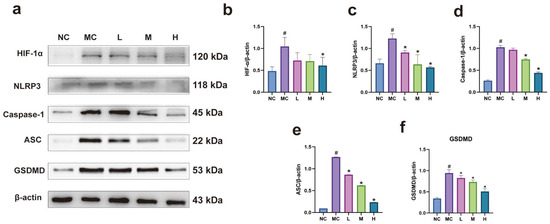 (a) Western blot band image; (b–f) bar charts illustrating statistical data on the expression of pyroptosis-related proteins: NC: normal group, MC: model group (CoCl2: 300 μM), L: low-dose emodin group (CoCl2: 300 μM, Emo: 5 μM), M: medium-dose emodin group (CoCl2: 300 μM, Emo: 10 μM), H: high-dose emodin group (CoCl2: 300 μM, Emo: 20 μM). Compared to the normal group, # p < 0.05 for the model group; compared to the model group, * p < 0.05 for the emodin groups.