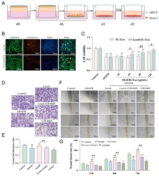According to former research [28], we established a co-culture system of ECs and pericytes. Transwell chambers were placed in a 6-well plate and 1 mL of MBVP suspension was evenly added to the upper layer, while DMEM culture medium was added to the lower layer to maintain consistent liquid levels between the internal and external compartments. Meanwhile, a 2 mL suspension of bEnd.3 cells was inoculated into another 6-cell plate. Approximately one day later, the MBVPs were subjected to oxygen–glucose deprivation, resulting in their impairment. During reoxygenation, the transwell chambers were transferred to the 6-well plate previously inoculated with bEnd.3 cells and supplemented with DMEM to ensure equal liquid levels between the inner and outer compartments. At same time, leech, leech + GW4869 (#6823-69-4, MCE, Dallas, NJ, USA), and GW4869, an exocrine inhibitor, were given to the lower layers, in their respective administration groups for further culture for 24 h.