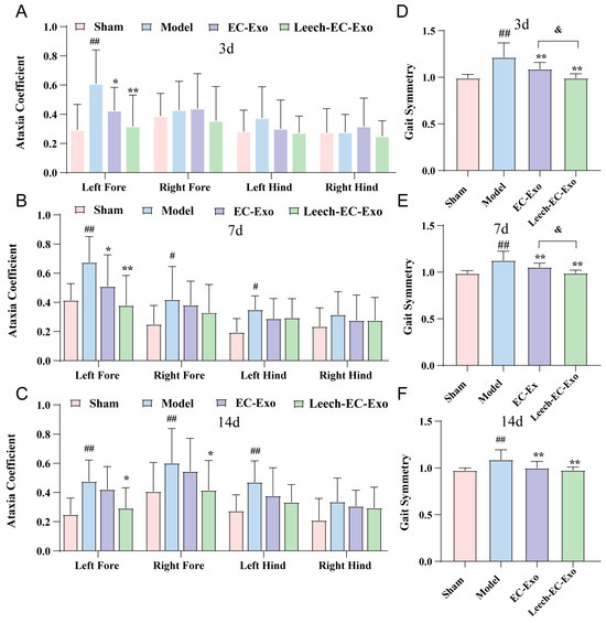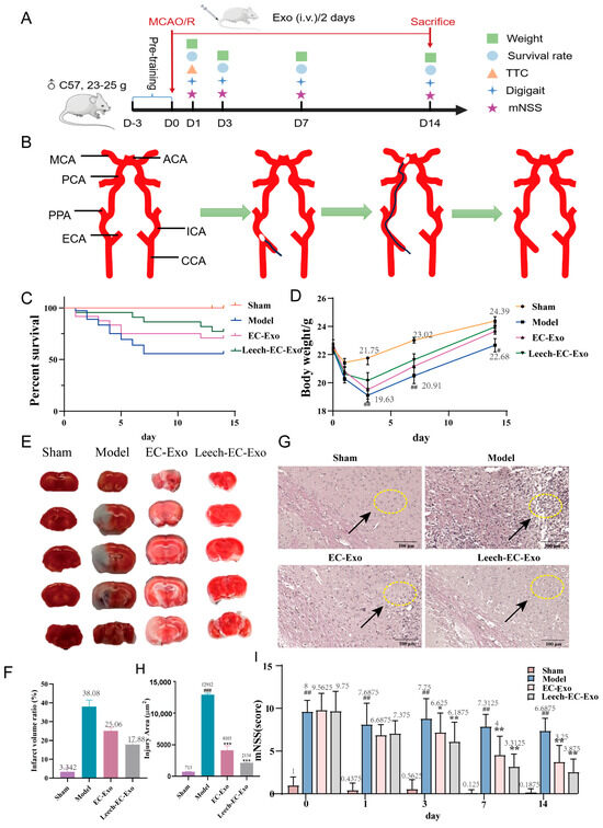 The successful mice were randomly allocated into the Model group, EC-Exo group (60 μg/mouse) [26,31,32,33], and Leech-EC-Exo group (60 μg/mouse). Exosomes were administered 2 h after reperfusion, which corresponded to the timing of most stroke patients’ interventions (144 min) [34]. The mice were intravenously injected with the test substance every other day seven consecutive times, while the Control and Model groups received injections of PBS. The dosage and frequency of administration were determined based on previous research.