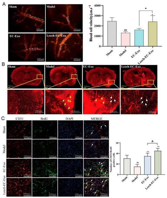 In the present study, we established an in vitro endothelial cell–pericyte co-culture system to model oxygen–glucose deprivation/reoxygenation (OGD/R), and an in vivo MCAO/R model in mice. We conducted investigations to determine whether leech can enhance the proliferation and migration of pericytes through EC-Exo, employing cell migration assays and cell scratch assays. Subsequently, we employed TTC staining, modified neurological severity score (mNSS), gait tests, and HE staining to assess the therapeutic efficacy of leech in ameliorating MCAO injury in mice. Additionally, immunofluorescence, laser speckle imaging, and an in vivo imaging system were utilized to investigate the angiogenic potential of Leech-EC-Exo. Relevant to the exploration of its mechanism, Western blotting (WB) and differential miRNA analysis were employed.