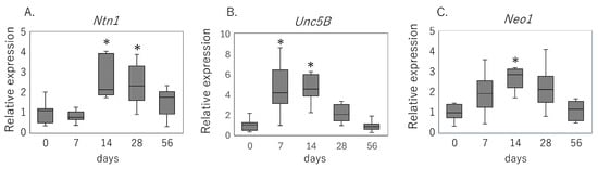 Temporal expression of netrin-1 and its receptors after rotator cuff tear. Relative mRNA levels of (A) Ntn1, (B) UNC5B, and (C) Neo1 in rat supraspinatus tendon at 0 (intact), 7, 14, 28, and 56 days following rotator cuff injury, as measured by quantitative RT-PCR. Data are shown as box-and-whisker plots indicating the median, interquartile range, and full range. * p < 0.05 versus day 0 (Kruskal–Wallis test with Bonferroni correction).