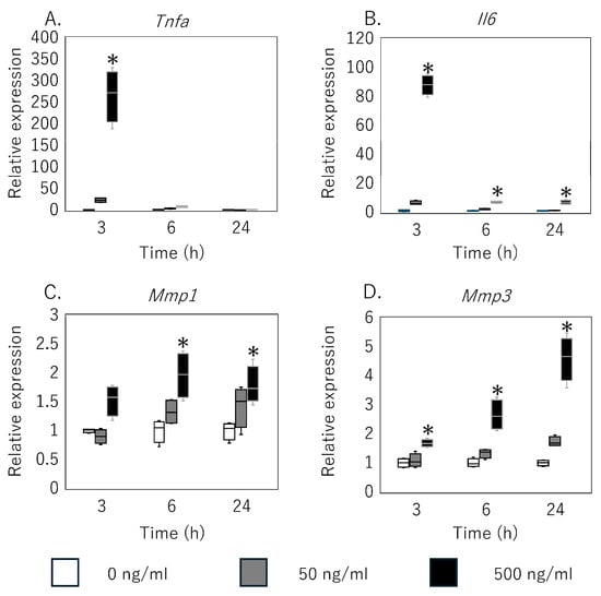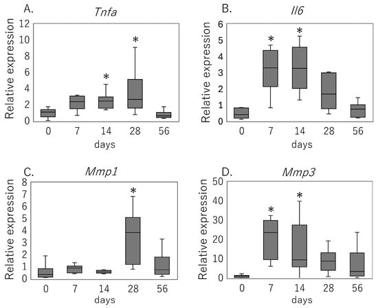 Temporal expression of inflammatory cytokines and MMPs after rotator cuff tear. Relative mRNA levels of (A) Tnfa, (B) Il6, (C) Mmp1, and (D) Mmp3 in rat supraspinatus tendon at 0 (intact), 7, 14, 28, and 56 days following rotator cuff injury, as measured by quantitative RT-PCR. Data are shown as box-and-whisker plots indicating the median, interquartile range, and full range. * p < 0.05 versus day 0 (Kruskal–Wallis test with Bonferroni correction).