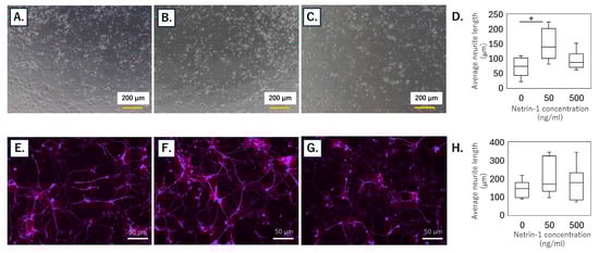 Effect of recombinant netrin-1 on neurite outgrowth in human iPSC-derived sensory neurons. (A–C) Representative phase-contrast images of neurons at day 4 after treatment with (A) vehicle, (B) 50 ng/mL netrin-1, or (C) 500 ng/mL netrin-1. (D) Quantification of total neurite length per neuron at day 4 for vehicle, 50 ng/mL, and 500 ng/mL treatments. (E–G) Representative fluorescence images of TUBB3-stained neurons at day 14 after treatment with (E) vehicle, (F) 50 ng/mL netrin-1, or (G) 500 ng/mL netrin-1. (H) Quantification of total neurite length per neuron at day 14 for vehicle, 50 ng/mL, and 500 ng/mL treatments. Data in (D,H) are presented as box-and-whisker plots indicating the median, interquartile range, and full range. * p < 0.05 versus vehicle (0 ng/mL) (Kruskal–Wallis test with Bonferroni correction).