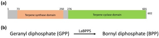 Lavandula angustifolia bornyl diphosphate synthase (LaBPPS) possesses two conserved domains: the terpene synthase domain (aa 73–250) and the terpene cyclase domain (aa 276–601) (Figure 1a and Figure S1). LaBPPS catalyzes the conversion of geranyl diphosphate (GPP) to bornyl diphosphate (Figure 1b). The LaBPPS sequence was retrieved from the UniProt database (accession number A0A185NWC6). The molecular weight of LaBPPS is estimated to be approximately 70.67 kDa, with the molecular formula C3162H4889N841O933S33 and an isoelectric point (pI) of 5.16.