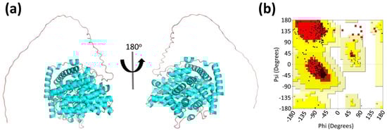 Prediction and quality assessment of LaBPPS structural model. (a) The three-dimensional (3D) structure of LaBPPS was predicted using AlphaFold2. (b) Structural validation of LaBPPS was performed through the Ramachandran Plot analysis. The most favored regions are indicated in red, while regions with less favorable conformations are shown in progressively lighter shades.